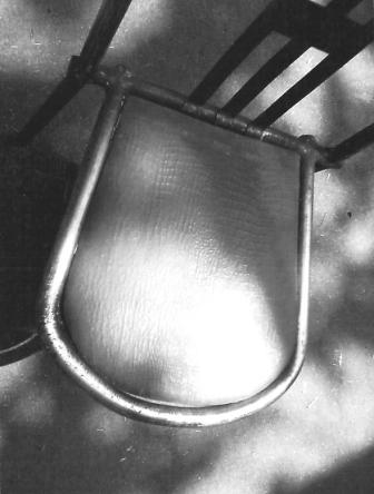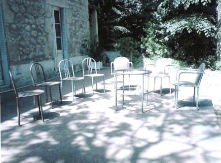 Les quatres chaises et les trois fauteuils sont fabriqués en tube d'acier inox avec une assise en bois revêtue de simili-cuir (le dossier des fauteuils est de même composition que les assises). La table est faite elle aussi de tube en acier inox, avec pour plate-forme, un cercle en verre fixé sur la table.